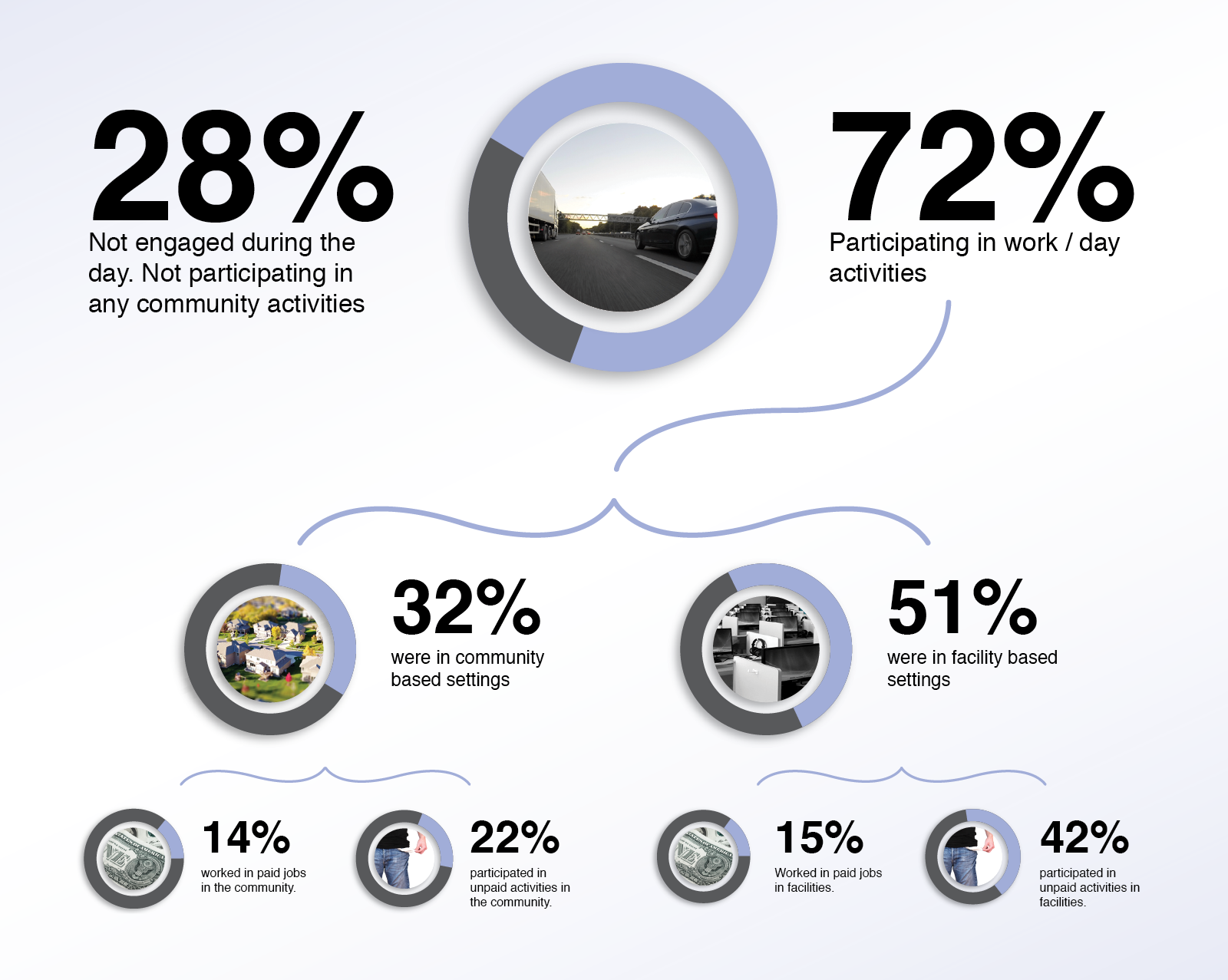 - 22% participated in unpaid activities in the community. Services focus on community involvement outside of work. Example: recreational, educational, or volunteer activities (often referred to as community integration or community participation services)