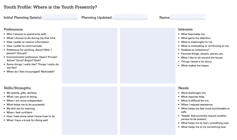 By discussing what is already known about the youth and their goals, it prevents spending time and resources gathering the same information. This will allow us to craft more individualized and meaningful questions to be used for our new transition assessment gathering process, detailed in Question 4 of the process. It may also allow us to think of what is missing and which team members may be best positioned to assist the youth in gathering the information through new transition assessment (both formal and informal). We will also know what additional team members the team could consider to help support the youth. - Opportunities for Ohioans with Disabilities (OOD) is an example of a new team member who may help a youth further explore careers or even a specific job.