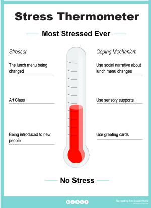 Discover the benefits of using coping and relaxation interventions to help individuals to self-regulate and cope with their emotions. The Stress Thermometer is a visual support that helps to identify an individual's stress level. Developed by Jeanette McAfee, it provides a visual illustration of an individual's stress indicators, represented as low, medium, or high, similar to a thermometer. Coping strategies are then provided to address each level of stress. Stress markers are listed on the left side of the thermometer and coping techniques are listed and correspond to the stress on the right side.