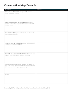 Create Conversation Maps to help individuals who struggle with social interactions with others. Developed by Scott Bellini, Conversation Maps provide a guide to help an individual initiate and maintain an interaction with others. The Conversation Map takes into consideration the perspective and interests of others to support social problem solving. A Conversation Map includes the following steps, which can be modified to meet the developmental needs of the individual: