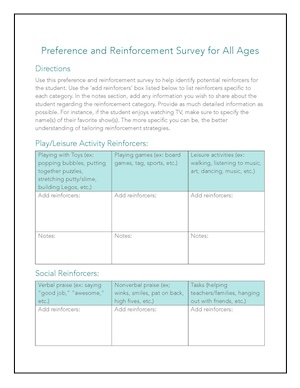 Explore preference and reinforcement surveys designed to gather insights into the interests and preferences of individuals with autism. These surveys are essential because they help educators and caregivers identify what motivates the individual, providing valuable information for selecting the most effective rewards or incentives to encourage positive behaviors. Educators, therapists, family members, and others involved in supporting the individual can utilize these surveys. They can be completed independently or in collaboration with others to gain a deeper understanding of the person’s preferences. If appropriate, some individuals with autism may also be able to provide direct feedback on the surveys. Once completed, the data collected can be used to support a reinforcement system and support the development of academic, social, and communication skills.