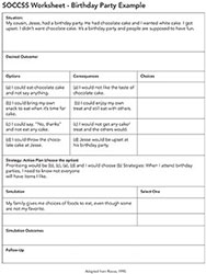 Explore SOCCSS (Situation, Options, Consequences, Choices, Strategies, Simulations). Developed by Jan Roosa, SOCCSS was designed as a teaching strategy to help individuals analyze and comprehend social interactions. The SOCCSS strategy provides a step-by-step process for helping an individual build the skills needed for social competence. This technique helps an individual to reflect on a problem or situation, determine alternative options and strategies, recognize consequences, and choose an appropriate course of action.