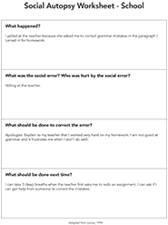 Consider developing and implementing a social autopsy. Social autopsies were developed by Richard Lavoie. The goal of the social autopsy is twofold: (a) to help the individual better understand a social situation, and (b) to assist the individual in responding more effectively when similar situations are encountered. The social autopsy helps individuals understand social errors committed during social interactions and promotes choosing alternative solutions to correct those errors in the future. Steps are provided that include: (a) identifying the error, (b) determining who was harmed by the error, (c) deciding how to correct the error, and (d) developing a plan so the error doesn't happen again. Using graphics to support comprehension can also enhance a social autopsy.