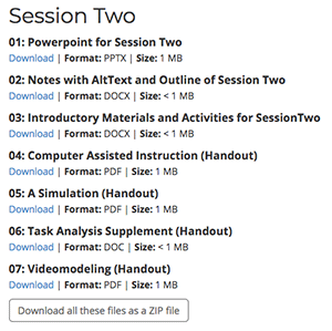 Each session includes a PowerPoint slideshow that provides the user with information about an evidence based practice or a planning process. Additional handouts or links to resources are offered in each session. Notes and activities offer more information for greater understanding, as well as to facilitate the presentation of the materials.